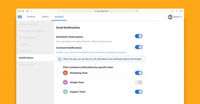 There’s a new Notifications Tab on the Account Page of the Dashboard where you can toggle comment notifications for your whole account, or by specific team.